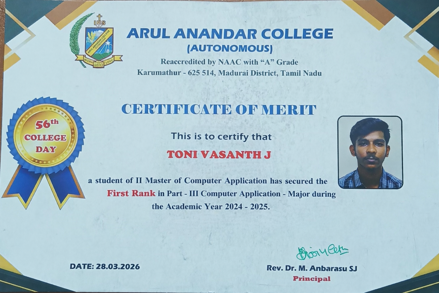 I am delighted to share that I have been awarded the Certificate of Merit during the 56th College Day. This recognition was for securing the First Rank in Major: Computer Applications.