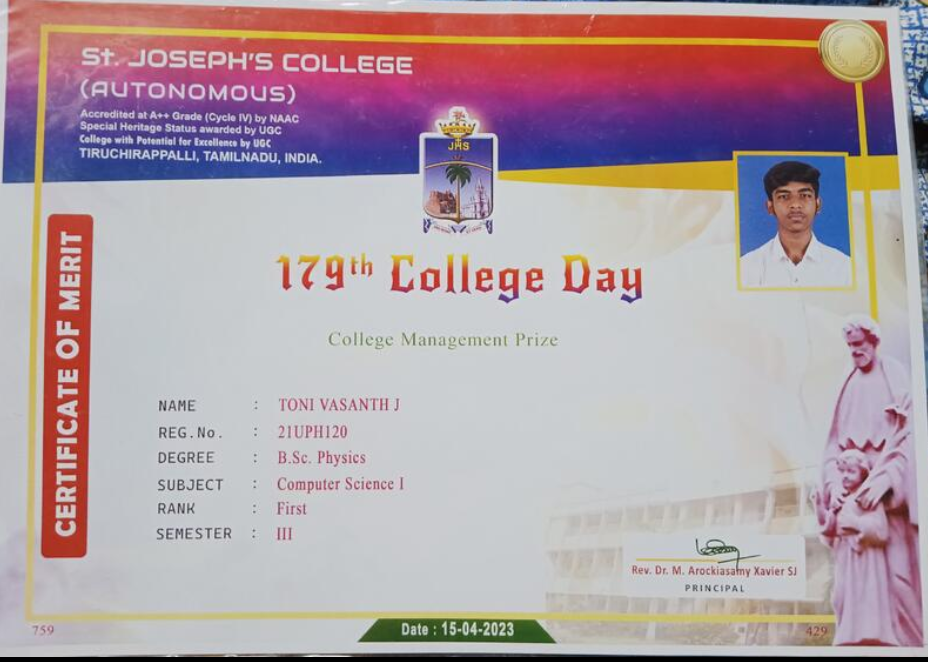 View CertificateSt. Joseph's College (Autonomous), Tiruchirappalli Β· Mar 2023