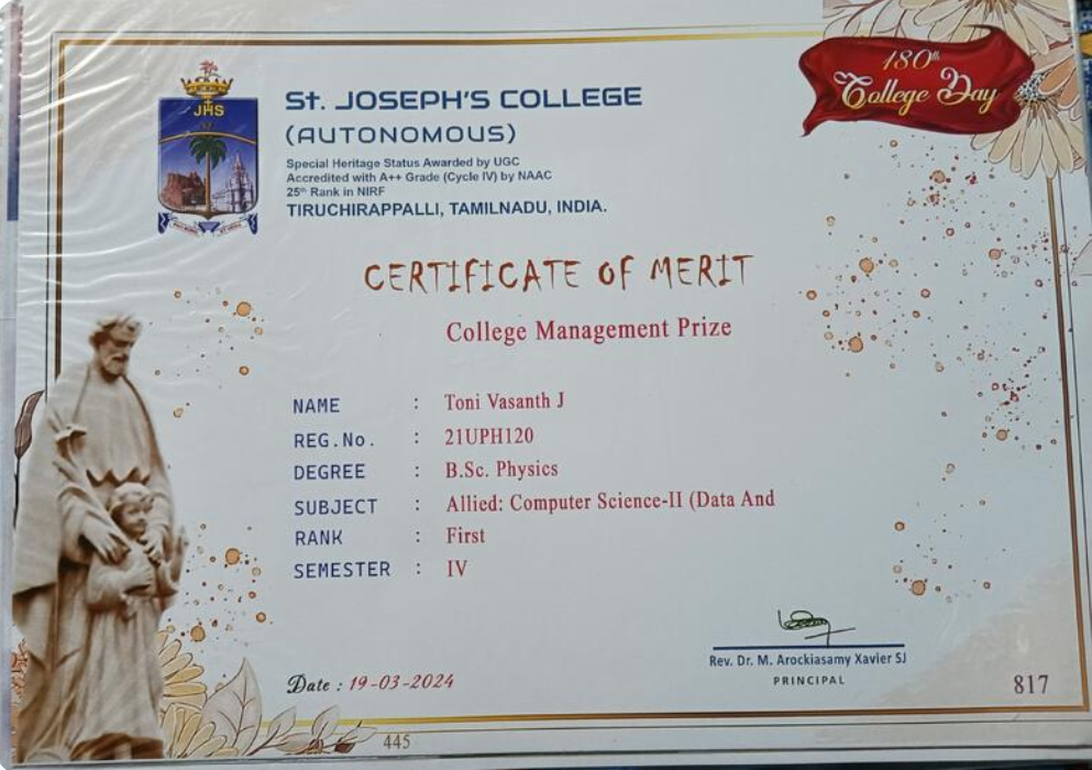 I am delighted to share that I have been awarded the Certificate of Merit during the 180th College Day. This recognition was for securing the First Rank in Allied: Computer Science 2 (Semester 4).